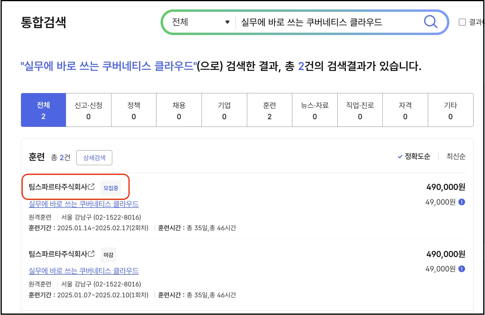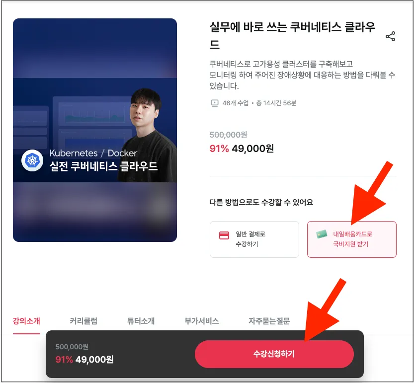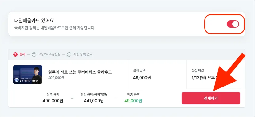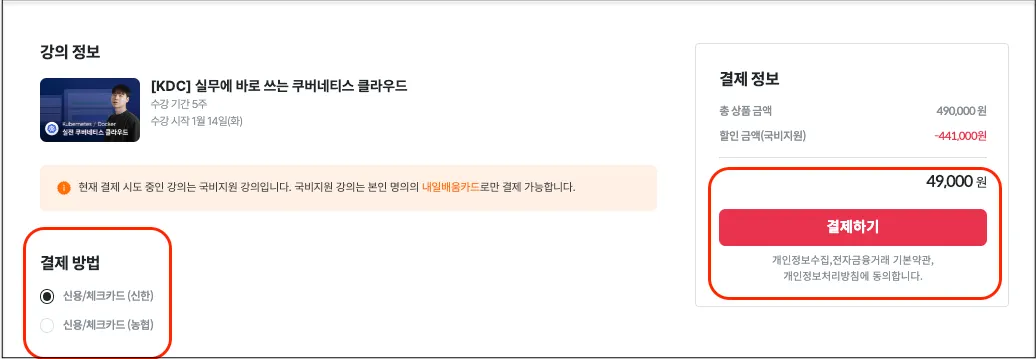 이 강의의 원래 비용은 490,000원이지만, 정부에서 441,000원을 지원해주어 내가 결제할 금액은 49,000원이 됩니다.