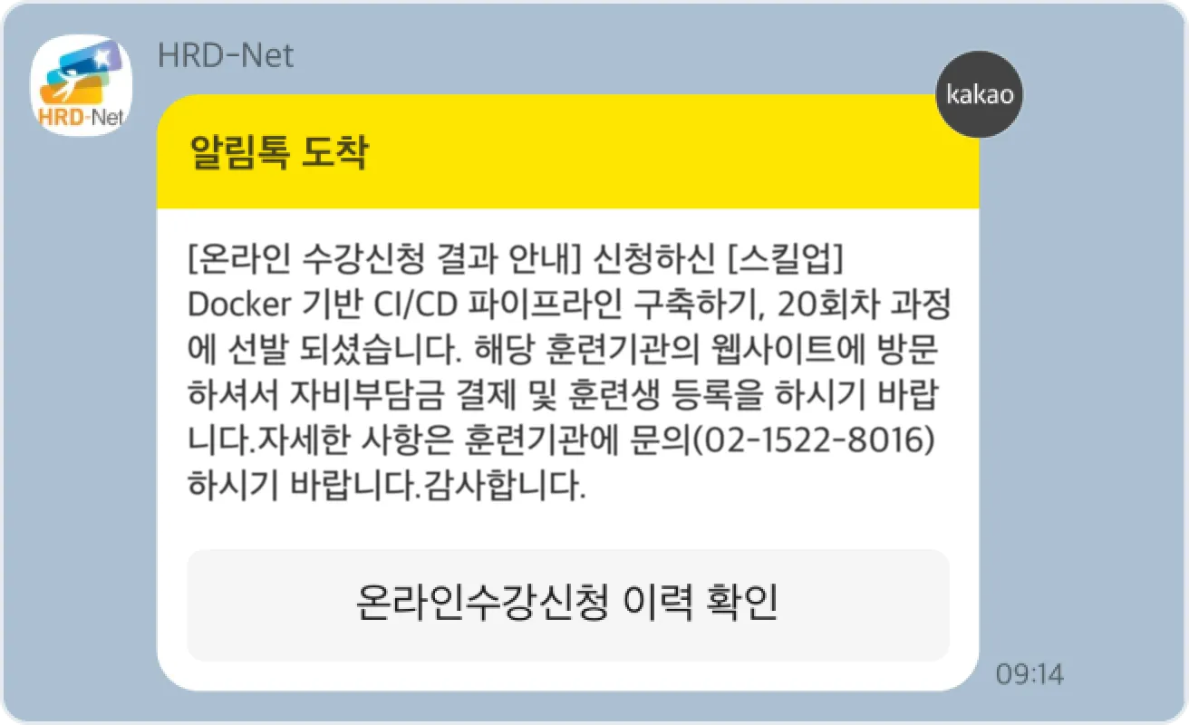 고용24 수강신청 후 약 10분 내로 선발 안내 문자 또는 알림톡이 전송돼요!